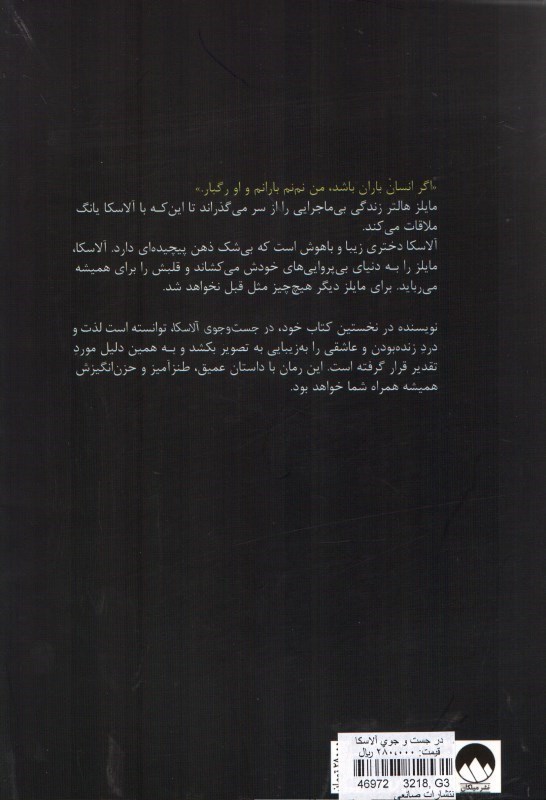فهرست مطالب * اگر انسان باران باشد من نم نم بارانم و او رگبار * مايلز هالتر زندگي بي ماجرايي را از سر مي گذراند با اين كه با آلاسكا يانگ ملاقات مي كند. آلاسكا دختري زيبا و باهوش است كه بي شك ذهن پيچيده اي دارد.آلاسكا مايلز را به دنياي بي پروايي دارد. آلاسكا مايلز را به دنياي بي پروايي هاي خودش مي كشاند و قلبش را براي هميشه مي ربايد.مايلز ديگر هيچ چيز مثل قبل نخواهد شد *