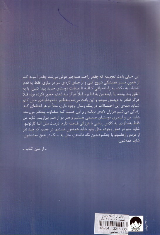 فهرست مطالب كتاب * اين خيلي باعث تعجبمه كه چقدر راحت همه چيز عوض مي شه چقدر آسونه كه * از همون مسير هميشگي شروع كني و از جايتازه اي سر در بياري فقط يه قدم * اشتباه يه مكث يه را انحرافي كافيه تا عاقبت دوستاي جديد 1يدا كنين يا به * اتفاق بد بيفته يا رابطه تون به فنا بره قبلا هرگز به ذهنم خطور نكرده بود قبلا * هرگز قادر به ديدنش نبودم و اين باعث مي شه به طور ناخوشايندي حس كنم * شايد همه ي اين اختمالات در يك زمان وجود دارن مثلا تو هر لحظه اي كه * زندگي مي كنيم هزاران لايه ديگه زير اون هست كه متفاوت به نظر مي رسه * شايد من و ليندزي دوستان صميمي هستيم و هر دو از هم بيزاريم شايد من * فقط به اندازه ي يه كلاس رياضي با هرزگي فاصله دارم درست مثل آنا كارتولو * شايد منم در عمق وجودم مثل اونم شايد همه مون هستيم در عجبم كه چند نفر * از مردم راز هاشونو با چنگ و دندون نگه داشتن مثل يه سنگ در عمق معده شون * شايد همه شون *